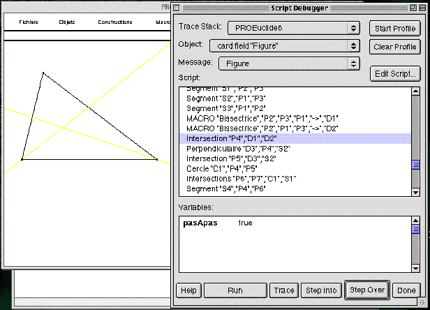 Ce programme est aussi exécutable pas à pas. On voit ci-dessous la figure après que les points P1, P2, P3 et le segment S1 (joignant P2 à P3) aient été tracés. La prochaine instruction à exécuter Segment "S2", "P1","P3" (i.e. le segment S2 joignant P1 et P3) est surlignée pour indiquer l'endroit où l'exécution en est rendue.