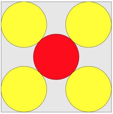 Tracer la figure suivante, où les 4 cercles jaunes sont tangents à deux côtés du carré et au cercle rouge. Dans la figure ci-dessous, tous les cercles sont de mêmes dimensions, mais ce n'est pas requis.