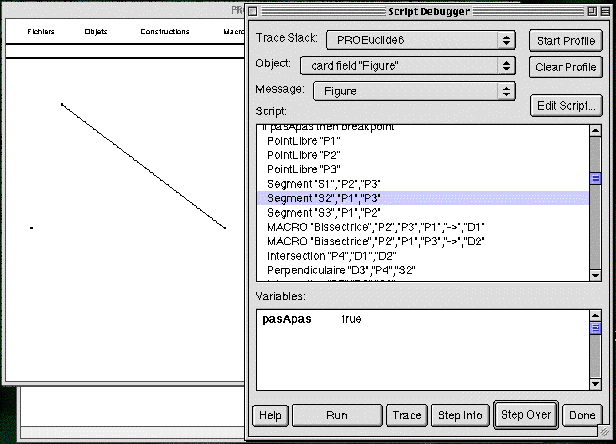 Ce programme est aussi exécutable pas à pas. On voit ci-dessous la figure après que les points P1, P2, P3 et le segment S1 (joignant P2 à P3) aient été tracés. La prochaine instruction à exécuter Segment "S2", "P1","P3" (i.e. le segment S2 joignant P1 et P3) est surlignée pour indiquer l'endroit où l'exécution en est rendue.