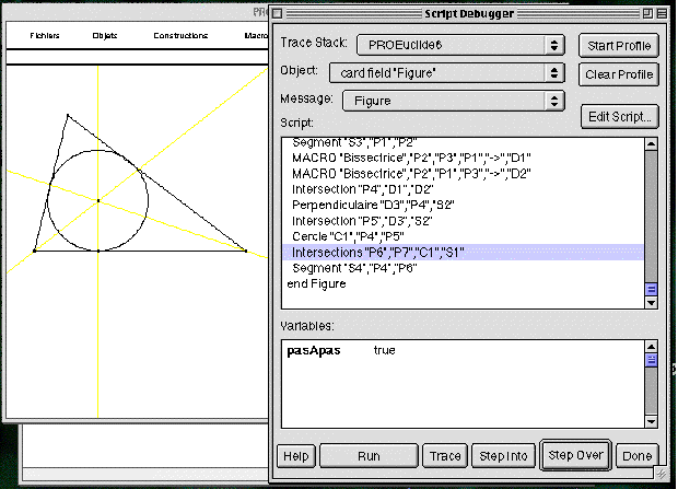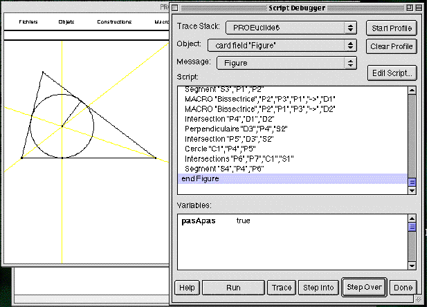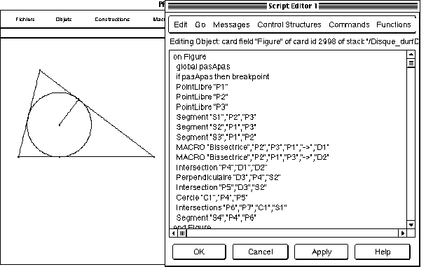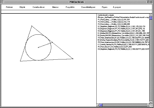 Dans ProEuclide, la figure est représentée sous la forme d'un programme. On voit ci-dessous le dessin du cercle inscrit dans un triangle avec le programme associé.