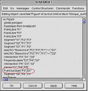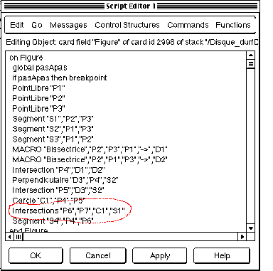Cette description de la figure sous forme de programme est aussi éditable. On voit ci-dessous l'état initial du programme avec la ligne de création des intersections du cercle inscrit avec le côté S1.