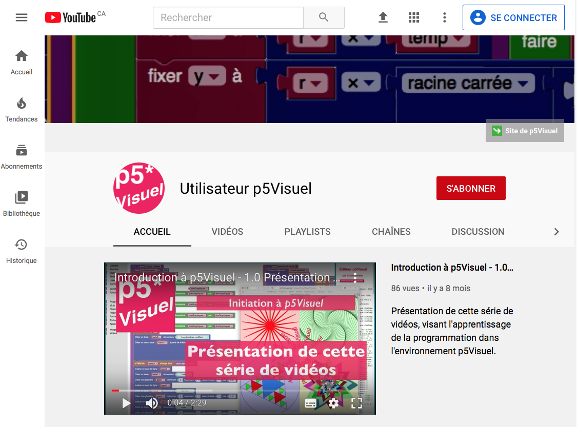 La documentation est un élément essentiel d'un logiciel, et un environnement de programmation en a particulièrement besoin, en raison de sa complexité. p5Visuel dispose déjà d'un site de documentation, mais il m'a semblé intéressant d'y incorporer des vidéos de formation. D'où le recours à ce site YouTube.