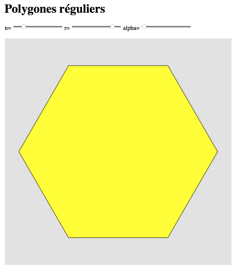 Ce petit programme est un autre exemple d'utilisation de la géométrie analytique dans p5Visuel. Il trace des polygomes réguliers dont les divers paramètres peuvent être déterminés par des glissières : nombre de côtés, rayon du cercle exinscrit, inclinaison.