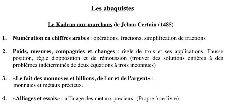 - Programme : arithémtique, algèbre, géométrie, tenue de livre, parfois arpentage.