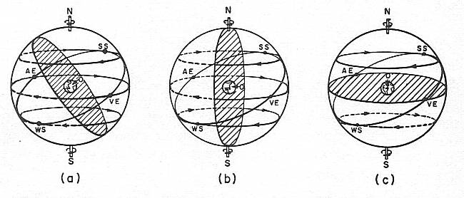 - L'image du Soleil sur le fond étoilé décrit en un an un grand cercle. Ce cercle est l'écliptique. Il fait un angle de 23 1/2° avec l'équateur de la sphère des étoiles.