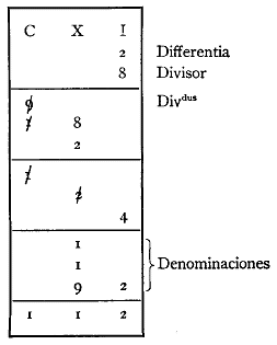 On a clairement besoin de donner des explications. Chacune des colonnes correspond aux ordres de grandeurs indiquées au haut de la colonne. Remarquez l’usage des nombres latins pour préciser l’ordre de grandeur. Le dividende (dividandus) est 900, alors que le diviseur est 8. ? Afin d’éviter des questions du style « combien de fois 8 va-t-il dans 900 ? », Gerbert va diviser par 10-2, d’où le 2 appelé Differentia. On peut suivre la suite de ses actions.