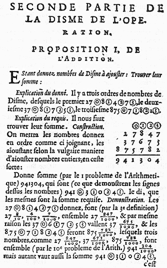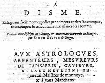 L’œuvre maîtresse pour la popularisation de l'usage des fractions décimales est celui de Simon Stevin (1548-1620), La Disme, paru en 1585 d'abord en flamand puis, la même année, en français. En voici un extrait de la première page de la version française (version de 1634).