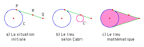 Mais ce choix d'implantation des points sur les objets est aussi à l'origine d'une différence entre les comportements mathématiques et informatiques de nos figures, tel qu'illustré par l'exemple suivant tiré de Nicolas Balacheff, Éclairage didactique sur les EIAH en mathématiques, Actes du Colloque du Groupe de Didactique des Mathématiques du Québec, Montréal, mai 1998. On trace d'abord un cercle C, puis on place un point P sur celui-ci. À l'aide d'un point Q à l'extérieur de C, on définit le segment PQ, sur lequel on place un point R. Si on demande à Cabri le lieu du point R quand P parcourt le cercle C, on obtient le cercle homothétique C ' de la figure (b) ci-dessous. D'un point de vue mathématique, le lieu cherché est en fait la région illustrée dans la figure (c) ci-dessous.