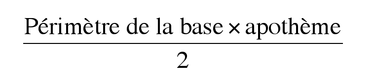 | Pyramide | ![]() | Varie selon le polygone qui forme les bases | Aire latérale + Aire de la base |
