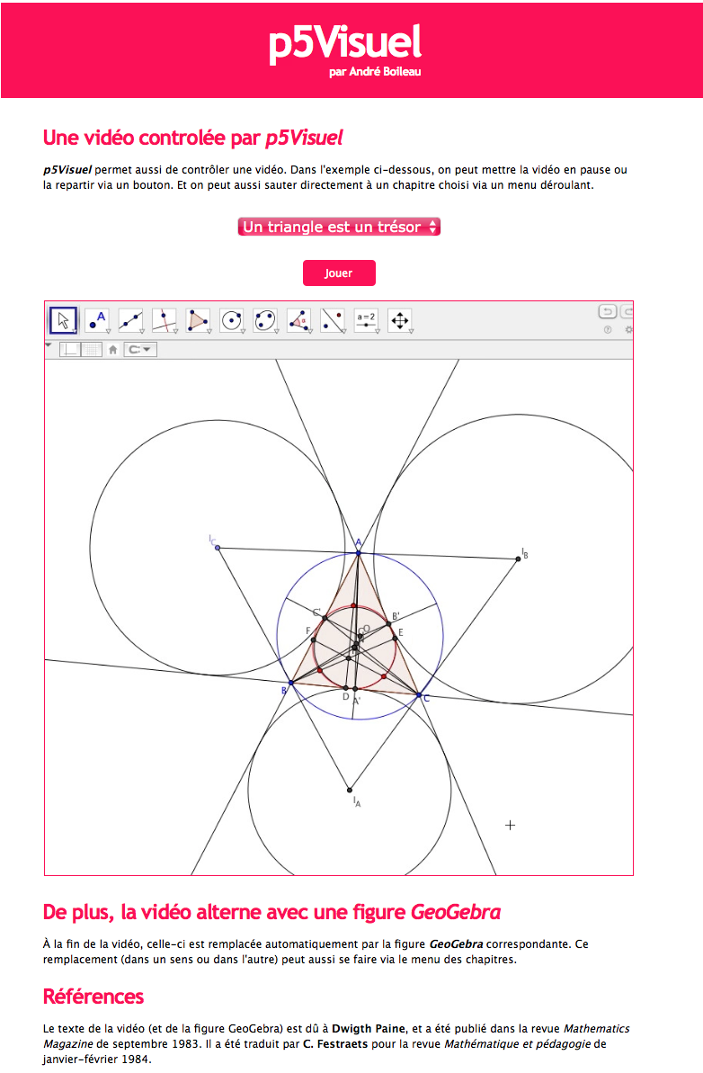 Avec p5Visuel, on peut aussi montrer et gérer des vidéos. Dans l'exemple fourni, on peut sauter au début de chacun des chapitres de notre vidéo à l'aide d'un menu. À la fin de la vidéo, celle-ci disparaît pour laisser place à la figure GeoGebra associée.
