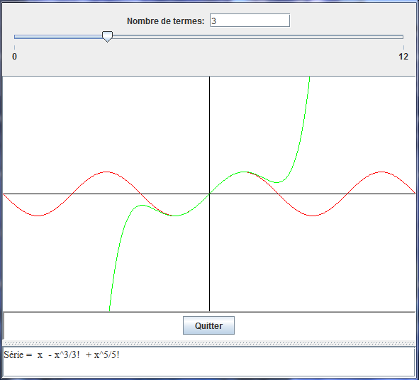 On forme un polynome P(n) en conservant les n premiers termes de la série et on trace les graphes du sinus (en rouge) et du polynome (en vert).